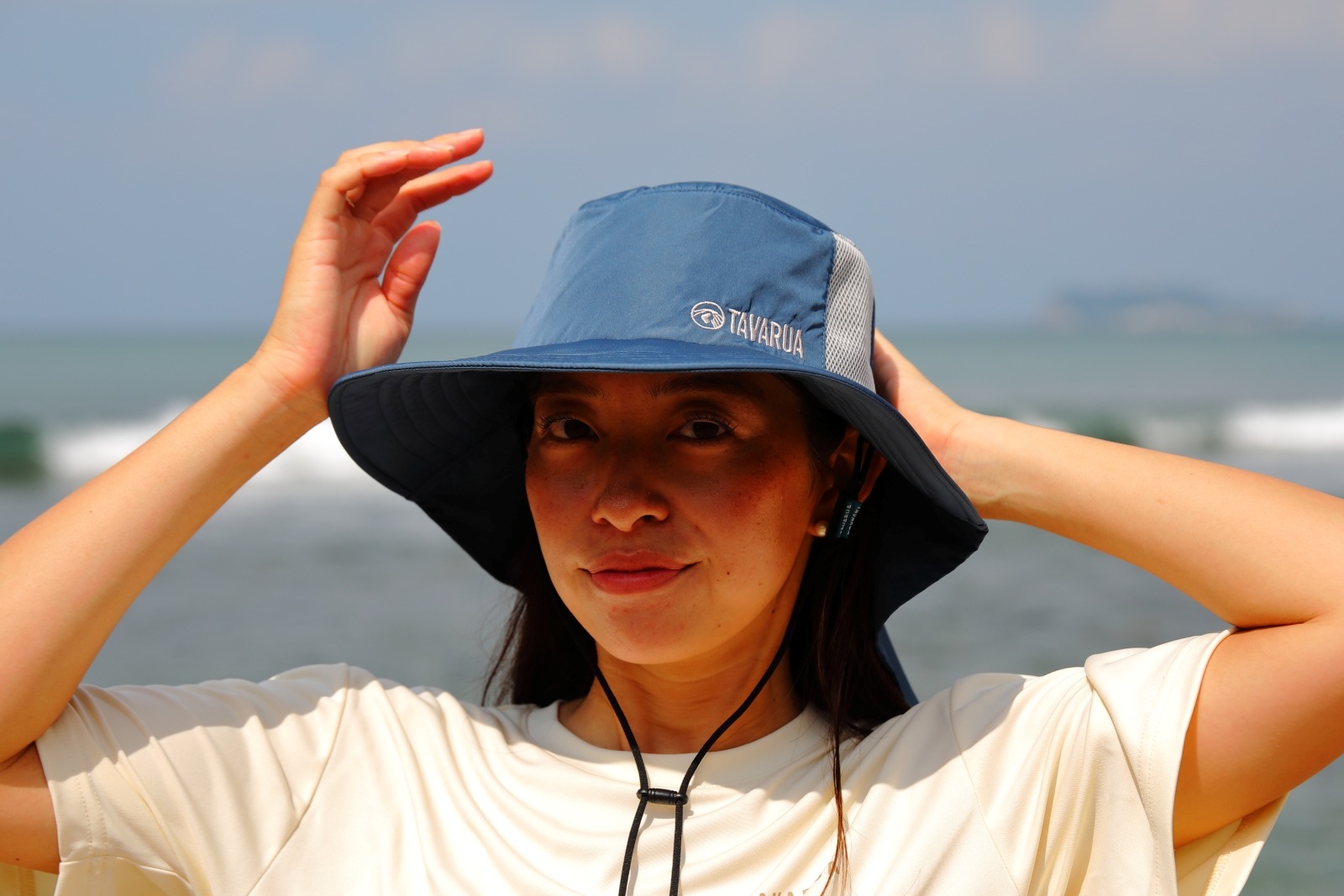 風の強い日でも帽子が飛ばされる心配がないよう、しっかりと固定できるアジャスター付きのあご紐も完備。